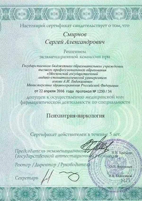 • 2013 г. — Сертификат специалиста: ГБОУ ВПО РНИМУ имени Н.И. Пирогова Минздрава России (психиатрия-наркология);